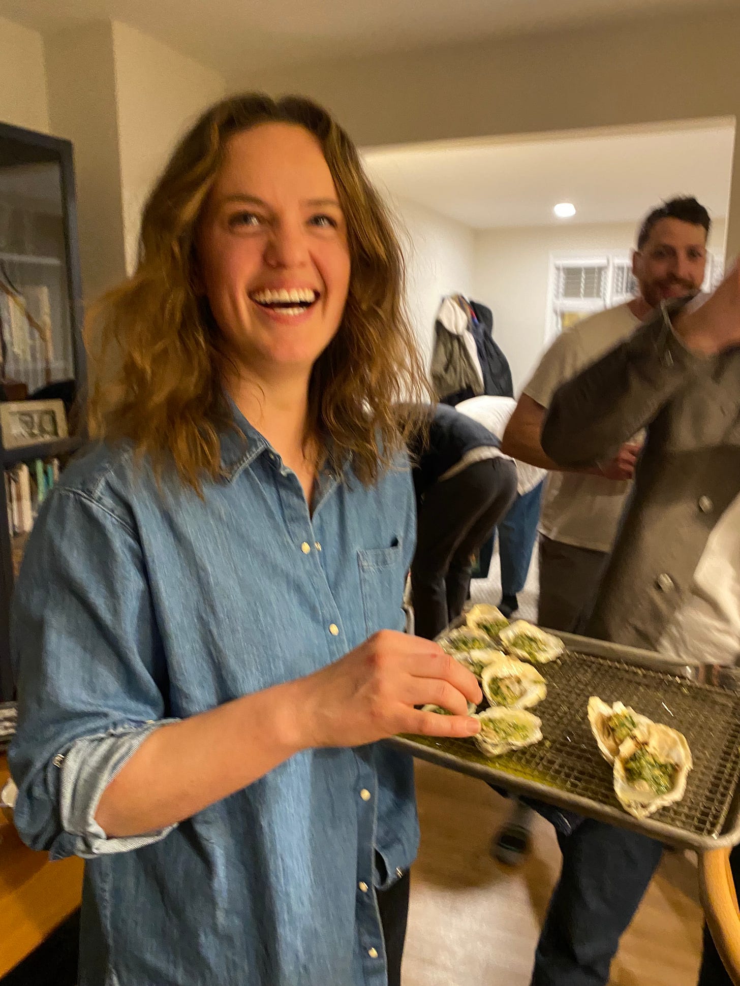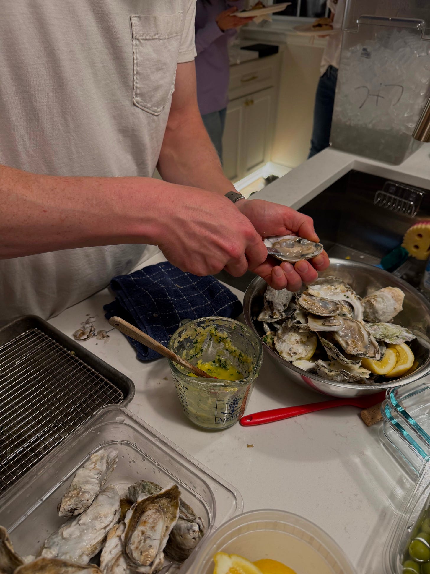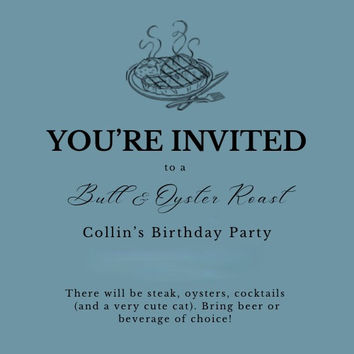 He determined the theme—a bull and oyster roast. After a quick Google search, I learned that it’s a social event popular in Maryland where oysters and pit beef sandwiches are served. We could make that happen. So I made invitations, sent them out, and set about researching how to make pit beef at home. Pit beef is a barbecue specialty specific to this area, where top or bottom round is grilled over charcoal until rare in the middle, sliced paper-thin, and served on Kaiser rolls with a creamy horseradish sauce and raw onion. It’s delicious and, as it turns out, pretty easy to make. I procured the oysters (about 100 of them) from our seafood purveyor, ordered the beef, and bought ingredients for French onion dip. I asked a friend to bring dessert.